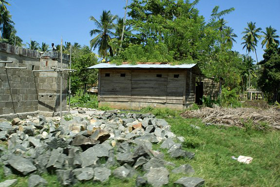 Sri-Lanker: "Hallo, sind Sie aus Deutschland?" Bei Dankesbekundungen dieser Art ist mir von wildfremden Menschen die Hand geschüttelt worden oder ich bin gar ganz spontan herzlich in den Arm genommen worden. Die Leute haben sich wieder und wieder verbeugt. Vermutlich ist es ein typisch deutscher Charakterzug, der sich in mir widergespiegelt hat, als ich verlegen vor diesen Menschen gestanden habe und als Antwort nur verschüchtert lächeln konnte. Diese echte, tief empfundene Dankbarkeit der Menschen ist bewegend und überwältigend gewesen, wobei ich ehrlich gesagt niemals damit gerechnet hätte, dass selbst Fremde sie auf diese Weise zum Ausdruck bringen würden. Eines weiß ich ganz genau: Hätte ich nach dem Tsunami selbst kein Geld gespendet, wäre ich angesichts dieser Dankbarkeit der Sri-Lanker vermutlich vor Scham tot umgefallen... So habe ich mir wenigstens sagen können, dass sie mir ja nicht unberechtigterweise gedankt haben. Aber es hat sich trotzdem merkwürdig angefühlt. Ich bin es einfach nicht gewohnt, dass plötzlich die Empfänger anonymer Spenden leibhaftig vor mir stehen und somit gewissermaßen ein Gesicht bekommen. Dies ist einer jener Aspekte gewesen, auf die ich vor meiner Reise in keiner Weise vorbereitet gewesen bin. Aber es hat ungemein gut getan zu sehen, dass mit dem gespendeten Geld bereits zahllosen bedürftigen Menschen geholfen worden ist, obwohl im November 2006 offenkundig gewesen ist, dass nach wie vor eine Menge Arbeit angestanden hat. Neuaufbau im Hinterland von Wadduwa