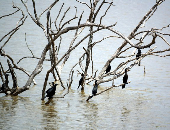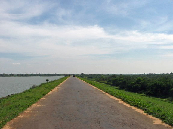 schnurgerade Straße fahren, die an einem Teil des Stausees entlang führt, siehe Foto rechts. Von dort aus sieht man bereits viele Vögel am Ufer