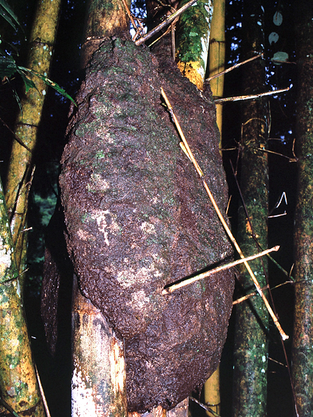 große Nester, die beispielsweise an Baumstämmen kleben.