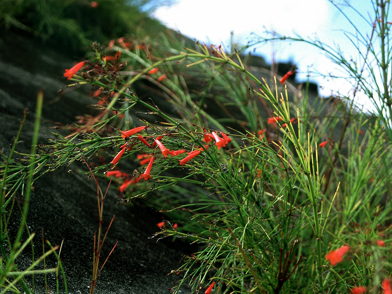 auffälligen rot gefärbten schlanken Blüten der Art sind etwa 2,5