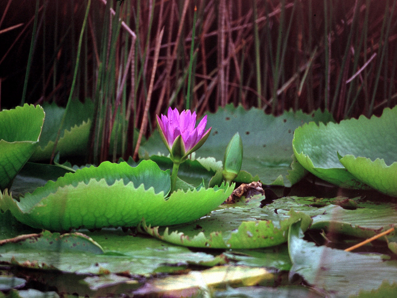 Tümpel entlang geführt, auf dem rosa Seerosenblüten schwammen. Dieser