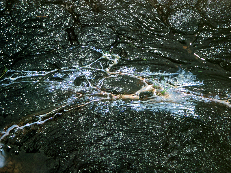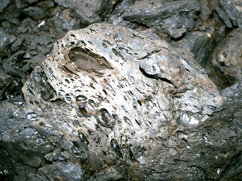 Rohasphalt zu sehen. An dessen Oberfläche sind blasenförmige Strukturen