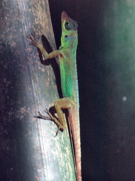 Vincent Anolis an Baumstämmen sitzen sehen, manchmal auch kopfüber. Dabei