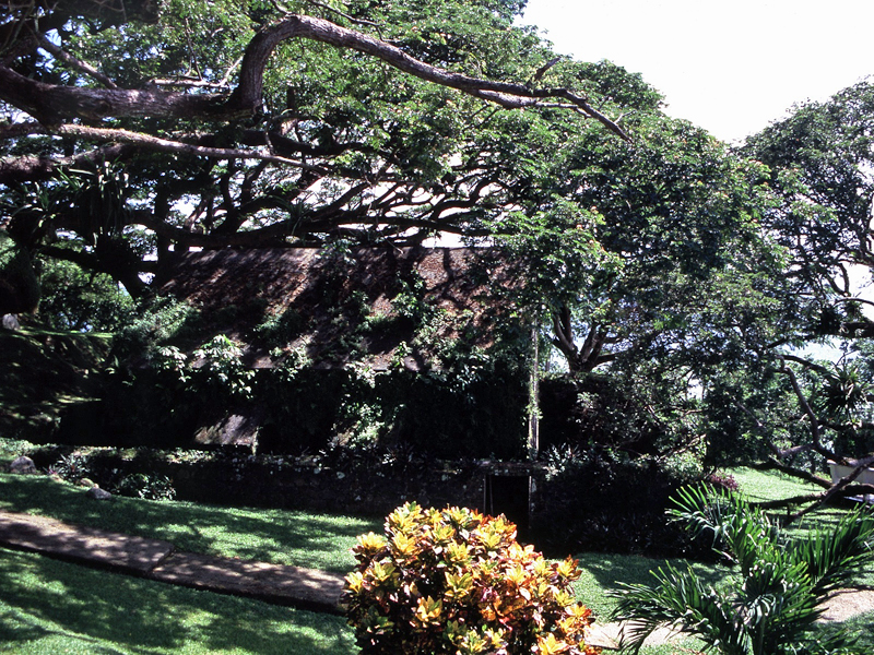 eines dieser ehrfurchtgebietenden Gewächse steht ein altes Gebäude, dessen Dach dicht mit