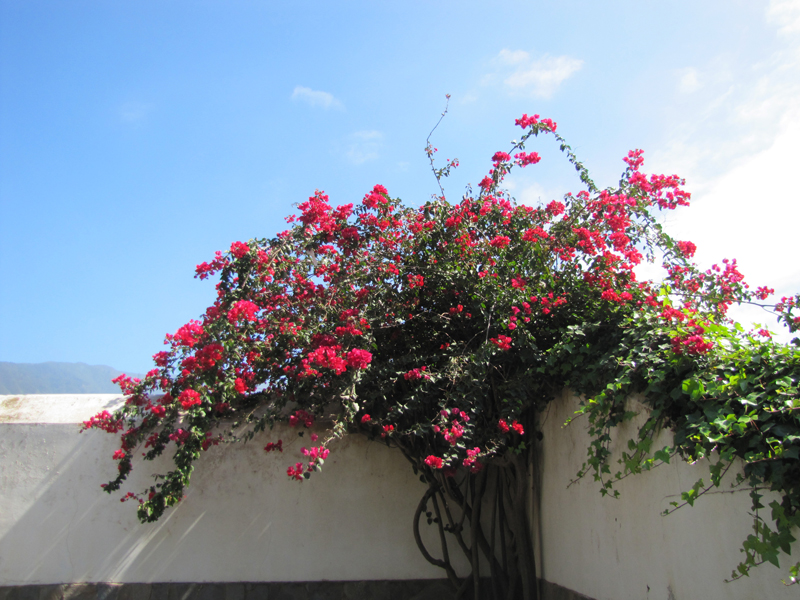 Pflanzen wie der in diesem Absatz gezeigten Bougainvillea umgeben.