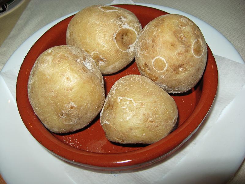Kulinarisches aus TeneriffaWer auf Teneriffa Urlaub macht, sollte sich keinesfalls die köstlichen kanarischen Spezialitäten entgehen lassen. Ich selbst habe nicht alles ausprobiert, was die einheimische Küche zu bieten hat, da ich Vegetarierin bin. Im Unterschied zu manch anderem Urlaubsziel bietet Teneriffa jedoch auch für Vegetarier eine Vielzahl schmackhafter Speisen. In den meisten Hotels wird das Essen als Buffet gereicht, sodass normalerweise für jeden Geschmack etwas Passendes dabei sein sollte. In diesem Kapitel stelle ich Ihnen einige Gerichte und Spezialitäten kurz vor, die Sie auf Teneriffa in Restaurants auf der Karte finden können; auch andere Kanarische Inseln bieten einige dieser Leckereien. Viele dieser Speisen bekommen Sie sogar in Hotels, weil gelegentlich ein einheimisches Buffet serviert wird. Ein Hinweis vorab noch zum Essengehen: Speisen Sie in einem Lokal, können Sie die ganze Palette der kanarischen Speisen erleben. Oftmals wird vorab eine Schale mit Brot auf den Tisch gestellt, zu der eine Knoblauchcreme serviert wird. Diese leckeren Speisen sind in vielen Fällen nicht wie in Deutschland kostenlos. Isst man das Brot, taucht es später auf der Rechnung auf. Papas arrugadas con mojo