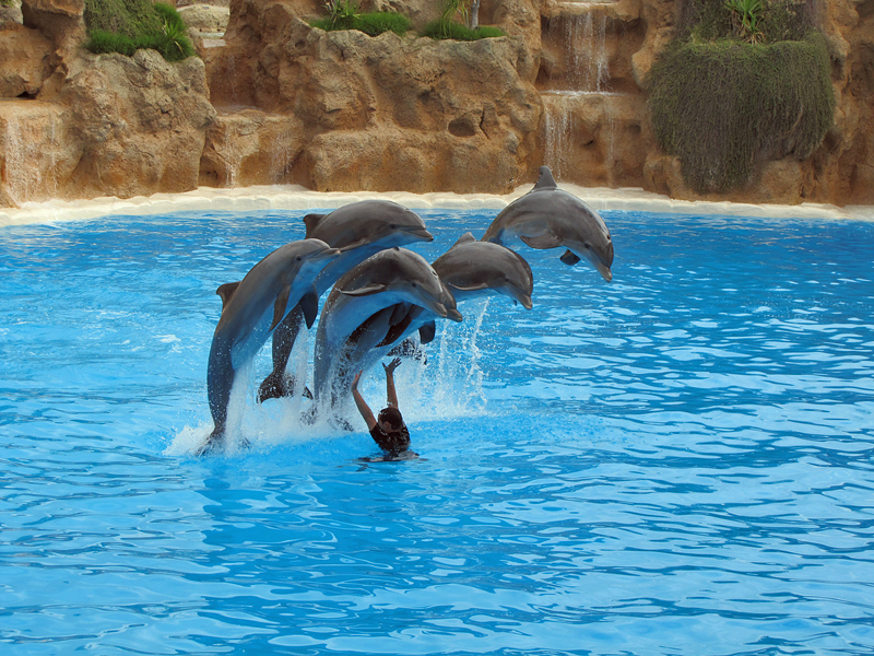 Szene aus der Delfinshow im Loro Parque |