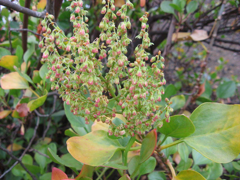 kleinen, weißlich bis rosa gefärbten Blüten sind in Kämmen angeordnet.