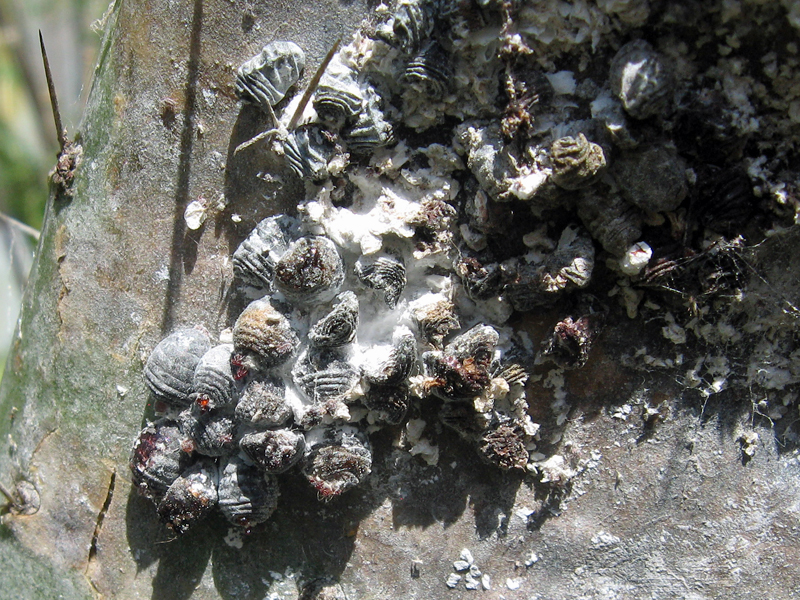 links. Dabei handelt es sich um Kokons. Foto: 31.03.2011, Puerto de