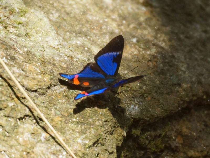 Hinterflügel in langen Zipfeln endenden sind ebenfalls blau gefärbt.