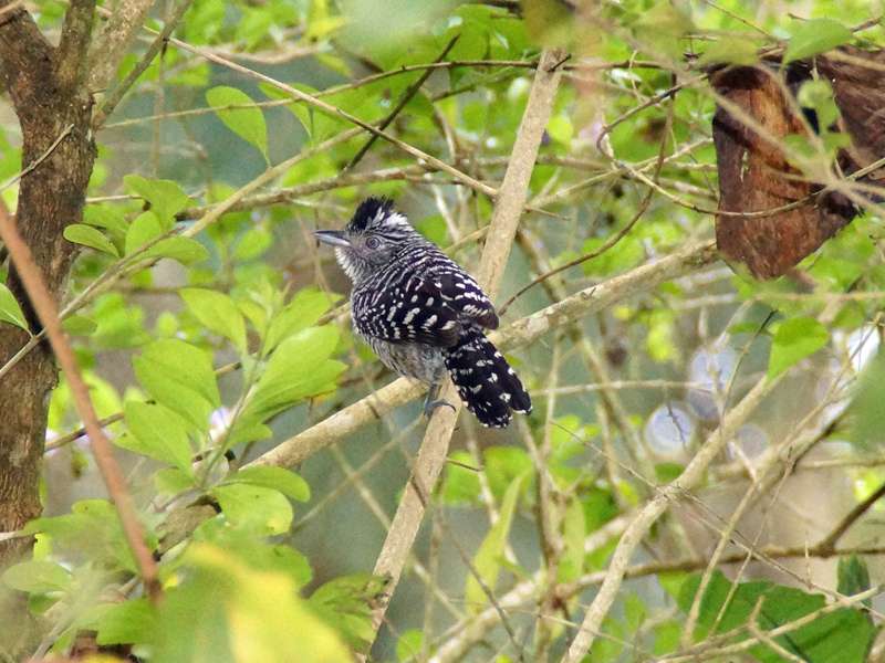 Aufgrund ihrer leisen Rufe und der Tatsache, dass sie sich häufig in Gebüschen aufhalten, gehören Bindenameisenwürger zu den unauffälligen gefiederten Bewohnern Venezuelas. Diese Vögel sind ist 16 Zentimeter groß und zumindest die Männchen sind dank ihrer typischen Gefiederfärbung leicht zu identifizieren. Sie haben schwarzes Gefieder, das viele weiße Streifen und Striche zeigt. Ihre Irisringe sind blassgelb gefärbt. Außerdem haben sie eine Federhaube, die sie aufrichten, wenn sie aufgeregt sind. Weibliche Bindenameisenwürger haben am gesamten Körper rötlichbraun gefärbtes Gefieder. Ihr Federkleid zeigt nur seitlich am Kopf und im Nacken ein Strichmuster, ein Federhäubchen haben die Weibchen genau wie ihre männlichen Artgenossen. Diese Vögel kommen in geeigneten Lebensräumen nahezu im gesamten Land vor. Bewohnt werden die unteren und mittleren Etagen von Wäldern. Früchte und Samen bilden die Nahrung dieser paarweise lebenden Tiere. Foto: 24.04.2013, Casa Maria, Bejuma