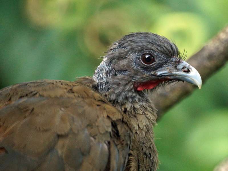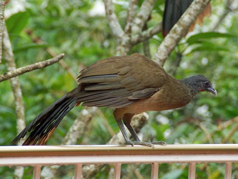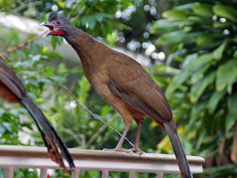 xeno-canto.org. Mit ihrer Körpergröße von 58 Zentimeter sind die Vögel recht groß. Ihr Gefieder ist auf der Oberseite des Körpers grünlich-braun gefärbt. Am Kopf, im Nacken und am Hals sind die Federn grau. Bronzefarben sind die langen und recht breiten Schwanzfedern. Rötlichbraun ist das Gefieder auf der Unterseite des Körpers gefärbt, die Beine und der nackte Hautring rund um die Augen sind dunkel blaugrau bis graubraun. Auffällig rot ist die unbefiederte Kehle, der an der Spitze nach unten gebogene Schnabel ist hellgrau. Die meist in kleinen Gruppen lebenden Vögel ernähren sich von Früchten, Beeren, Blüten, Blättern und Samen. Fast im gesamten Norden Venezuelas sind die Tiere heimisch. Sie leben vor allem in trockenen bis feuchten Wäldern und in Galeriewäldern. In Gärten kommen sie ebenfalls vor und sie können Menschen gegenüber recht zutraulich werden. Foto: 23.04.2013, Casa Maria, Nähe Bejuma