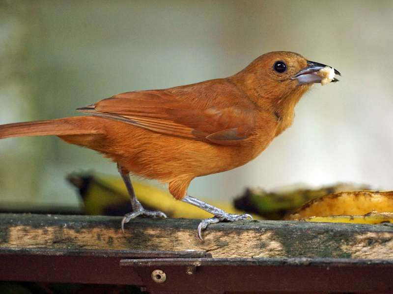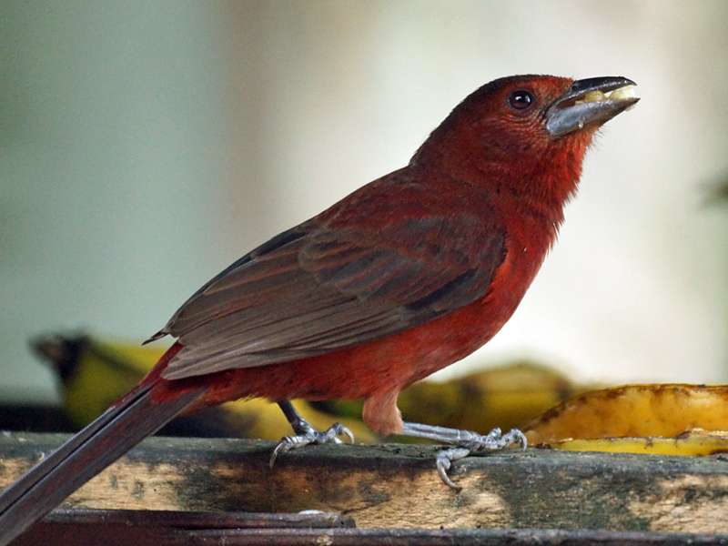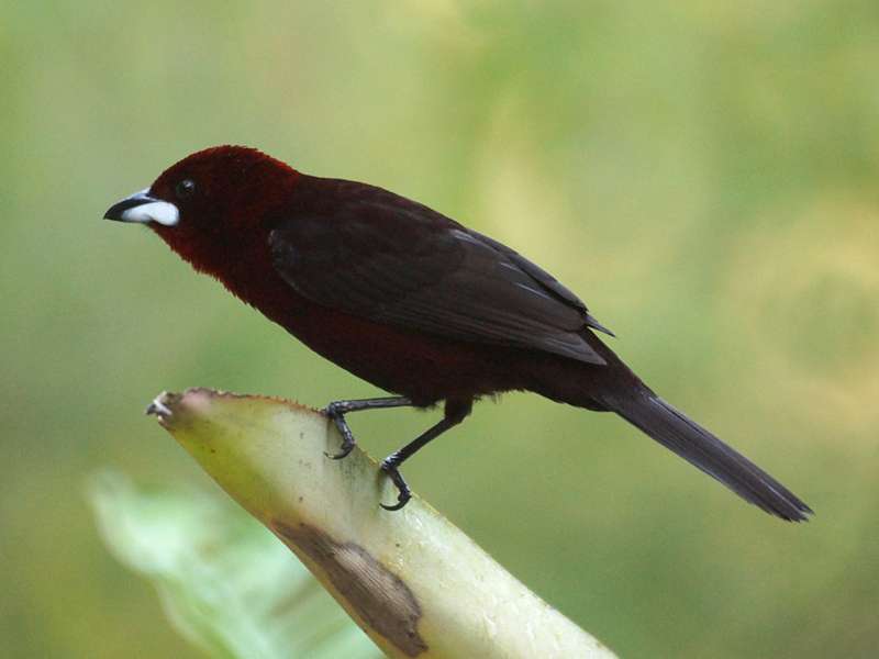 Etwa 18 Zentimeter beträgt die Körpergröße der Silberschnabeltangaren. Diese Vögel halten sich am liebsten in lichten Waldgebieten, in halb offenen Arealen mit Dickichten sowie auf Plantagen, auf Kulturland und an Waldrändern auf. Das Gefieder der Männchen ist fast am gesamten Körper samtig schwarz gefärbt, lediglich die Federn an ihrer Kehle und an der Brust sind dunkelrot gefärbt. An der Basis ist der Unterschnabel verbreitert. Er ist auffällig bläulich-silbrig gefärbt, wohingegen der Oberschnabel schlicht schwarz ist. Weibliche Silberschnabeltangaren haben auf der Oberseite des Körpers mattrotbraun gefärbte Federn, am Rumpf ist das Gefieder maronenbraun. Ihr Schnabel ist schwarz und nicht verbreitert wie derjenige der Männchen. Früchte und Nektar bilden die Hauptnahrung dieser Vögel, gelegentlich ergänzen sie ihren Speiseplan um Insekten. In Venezuela leben Silberschnabeltangaren fast im gesamten Land. Foto: 22.04.2013, Casa Maria, Nähe Bejuma