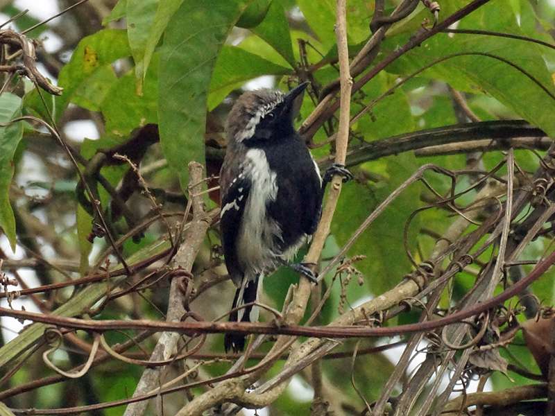 Die Körperlänge des Blassrücken-Ameisenfängers beläuft sich auf 12,7 Zentimeter. Leicht lassen sich bei dieser Vogelart die beiden Geschlechter anhand des äußeren Erscheinungsbildes unterscheiden: Bei den Weibchen sind die Federn auf der Oberseite des Körpers mittelbraun gefärbt, auf der Unterseite sind sie hellbraun bis cremefarben. An den Flügeln haben weibliche Individuen einige weiße Flecken und Streifen. Männchen haben auf der Oberseite des Körpers dunkelbraune Federn, die Unterseite trägt mittig von der Kehle bis zum Bauch schwarze Federn, die von einem Bereich mit weißen Federn umgeben werden. Das Gefieder ist im Gesicht ebenfalls größtenteils schwarz. Der Schnabel und die Beine sind bei den Männchen dunkel, bei den Weibchen ist der Schnabel meist eher hell. Paarweise durchstreifen Blassrücken-Ameisenfänger ihren Lebensraum, sie sind in trockenen bis mäßig feuchten Gegenden mit Gebüschen heimisch. Darüber hinaus kommen sie in Galeriewäldern sowie in Trockenwäldern und an Waldrändern vor. Kleine Wirbellose bilden ihre Nahrung. In Venezuela leben diese zierlichen Vögel in den nördlichen Landesabschnitten, sie fehlen in den Hochlagen der Anden. Foto: 21.04.2013, Casa Maria, Nähe Bejuma